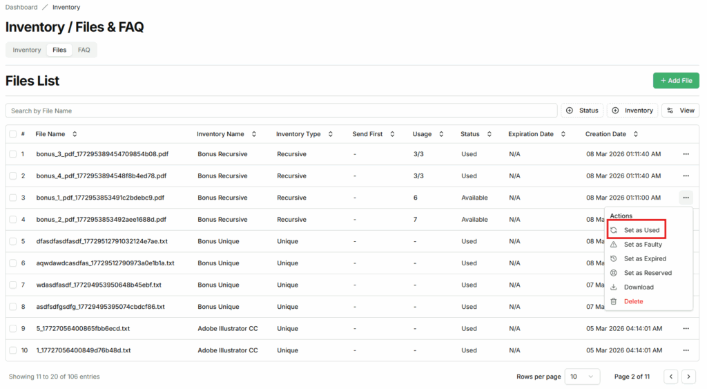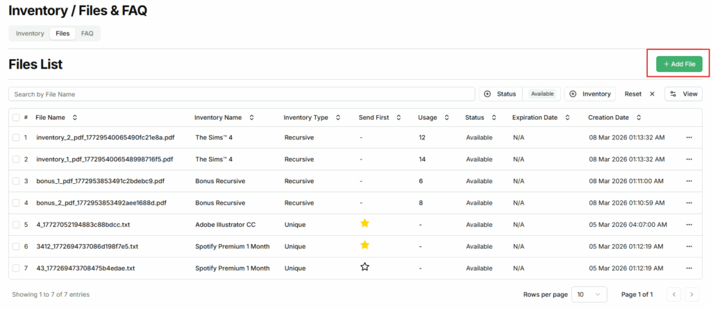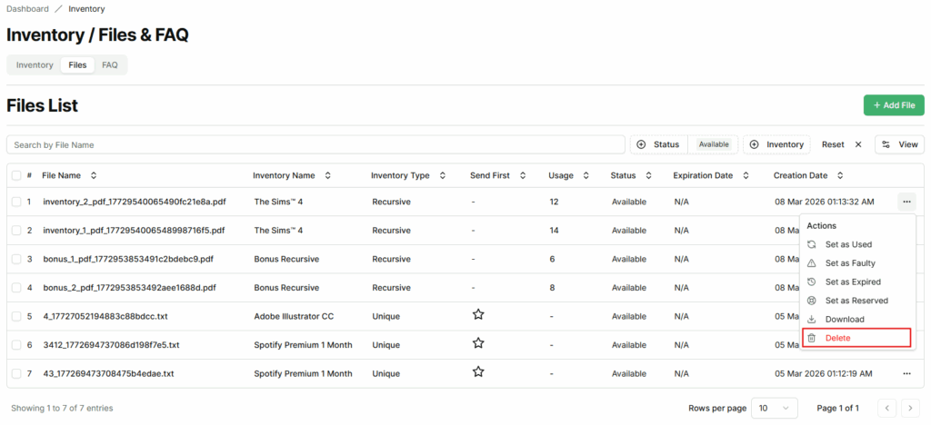 The Files List displays all files that are added and allocated to inventory items in the EZDZSEND platform. These files represent the actual digital content that can be available for delivery or delivered to customers based on their current status. Each file is linked to a specific inventory item and is managed directly from this section, allowing sellers to monitor availability, usage, and delivery priority. Inventory files may include text files, digital codes or keys (such as game keys or license keys), PDF documents, images, audio files, ZIP archives, and other supported digital file formats.
