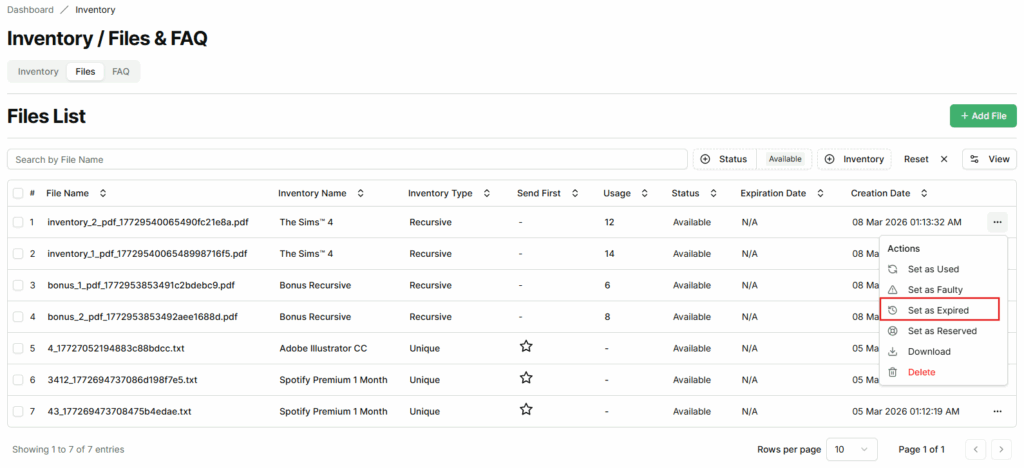- Sellers can mark a file as Expired regardless of its current status (Used, Available, Faulty, or Reserved).