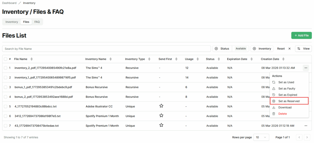 - Sellers can set a file as Available even if it was previously marked as Used, Expired, or Faulty, Reserved it to active status for delivery.