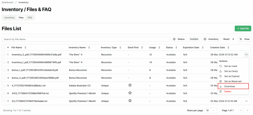 - Sellers can download files regardless of their current status (Available, Used, Faulty, Expired, or Reserved).