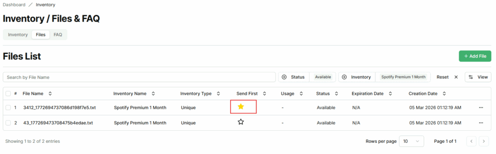 Sellers can prioritize specific files in an inventory by marking them as Send First. This feature allows selected files to be delivered before other files in the same inventory, according to the inventory’s delivery method (FIFO, LIFO, FEFO, or Auto-Random).