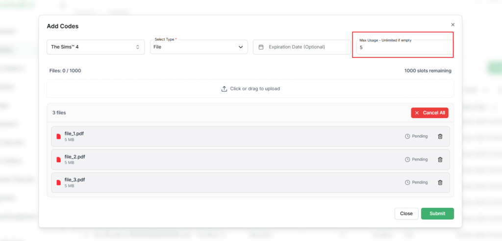 - Enter a number (for example: 5) → Limited to exactly that many deliveries. The code/file can only be sent 5 times in total. After the 5th delivery, it automatically becomes Used and will never be sent again.