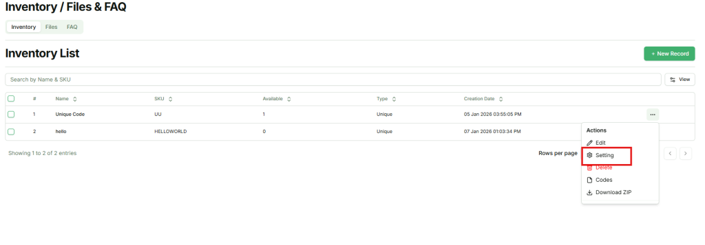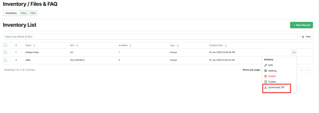 Here, sellers can view, manage, and download all codes or files associated with the inventory item efficiently.