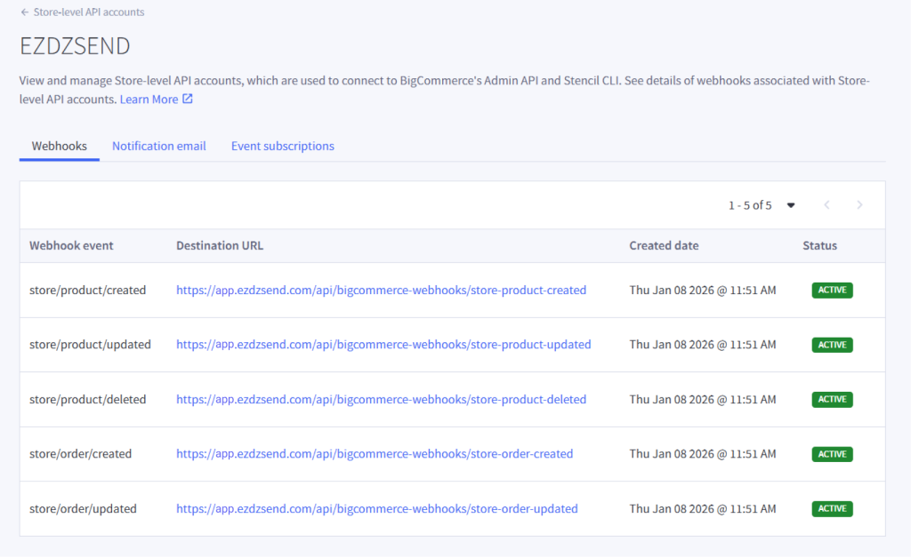 Once the store is connected there will be 5 active webhooks.