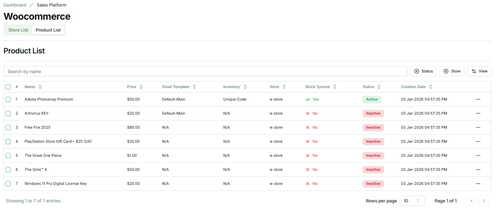 - All products from the connected store automatically appear in the Product List tab.