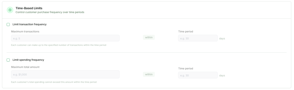 - Limit Spending Frequency (Example: 50$ total spent within 1 day)