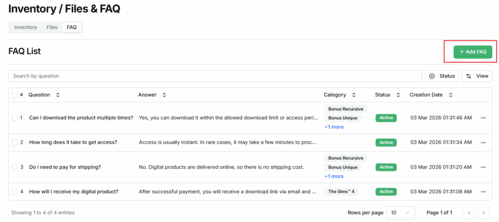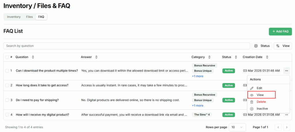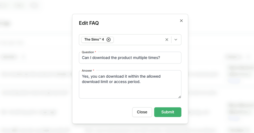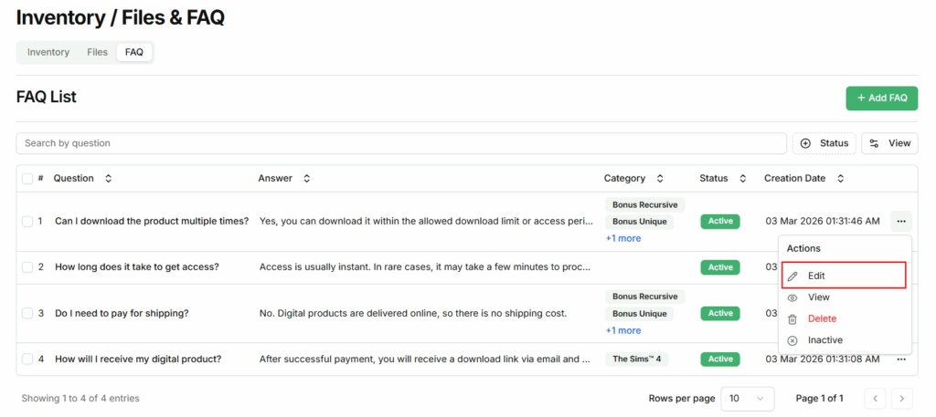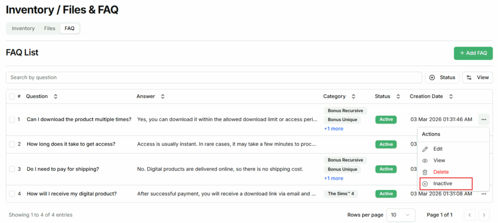- Inactive FAQs will not be visible to buyers on the Download Access Page.