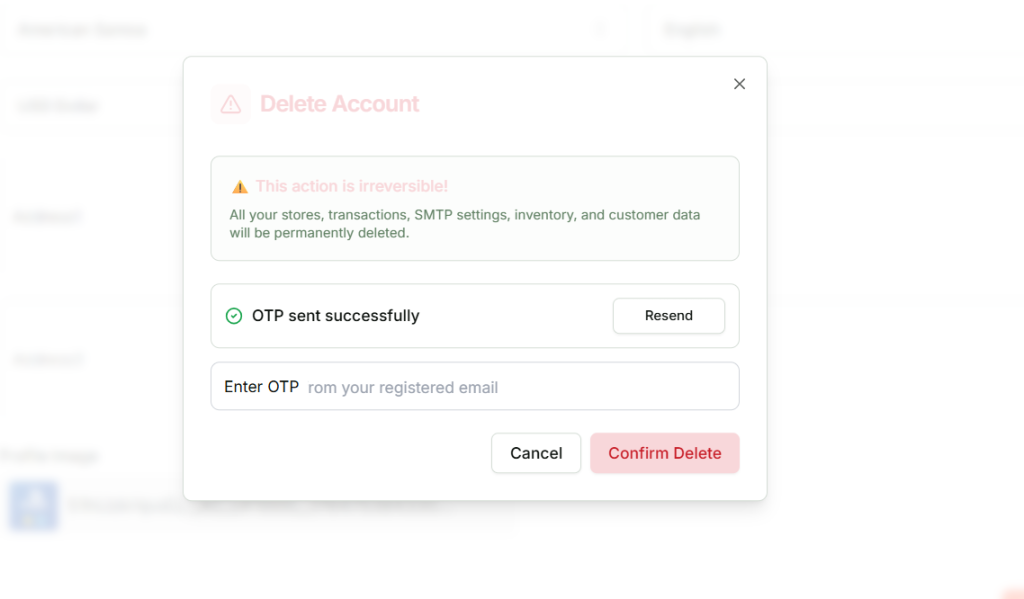 Deleting your account will permanently remove all your data from the platform, including stores, transactions, SMTP settings, inventory, and customer information. This action cannot be undone, so please ensure you have backed up any important data before proceeding.