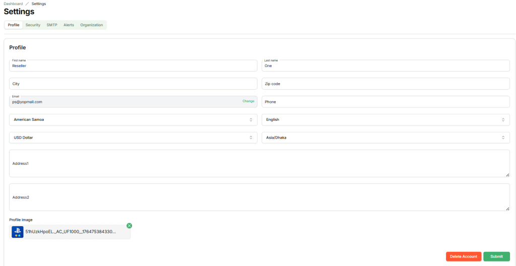 The Profile section allows users to add or update personal and account details, including name, contact information, address, country, language, currency, and timezone. Users can also upload or change a profile image and delete their account (permanent delete all data) if needed. The selected currency is used for all transactions, while the selected timezone is applied across the entire application for consistent date and time display.