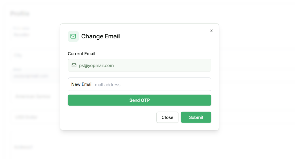 The Change Email feature allows users to update their registered email address securely. Users must provide their current email and new email, and verify the change using a one-time password (OTP). Once the OTP is successfully verified, the email address will be updated.