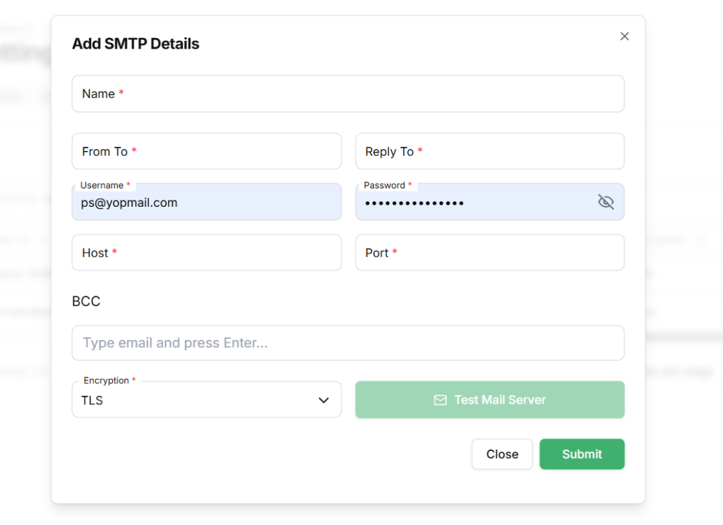 - Encryption – Select the encryption method (SSL or TLS) used for secure email transmission.