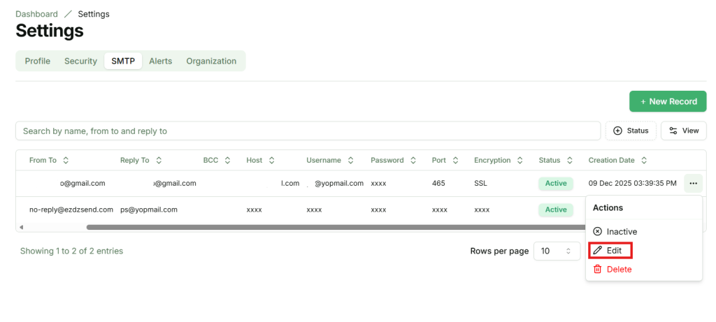 After updating the details, click Submit to apply the changes. The SMTP will be updated and reflected in the list.