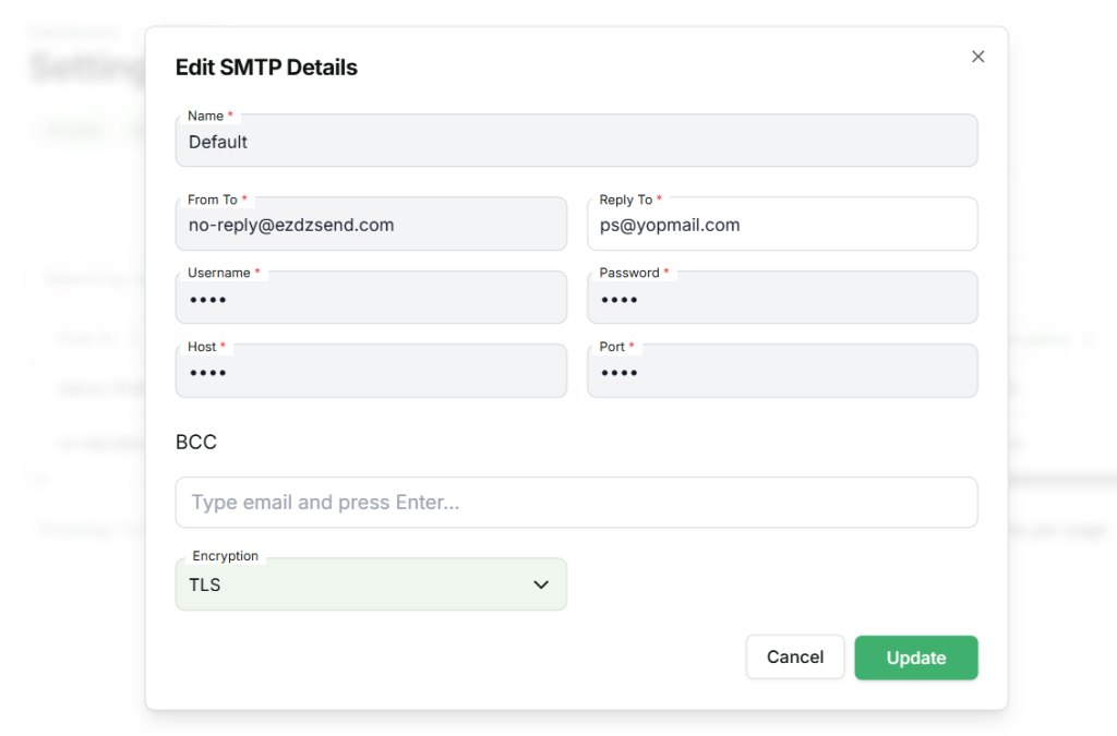 In the popup, click Edit. A modal will appear where you can update the SMTP details.