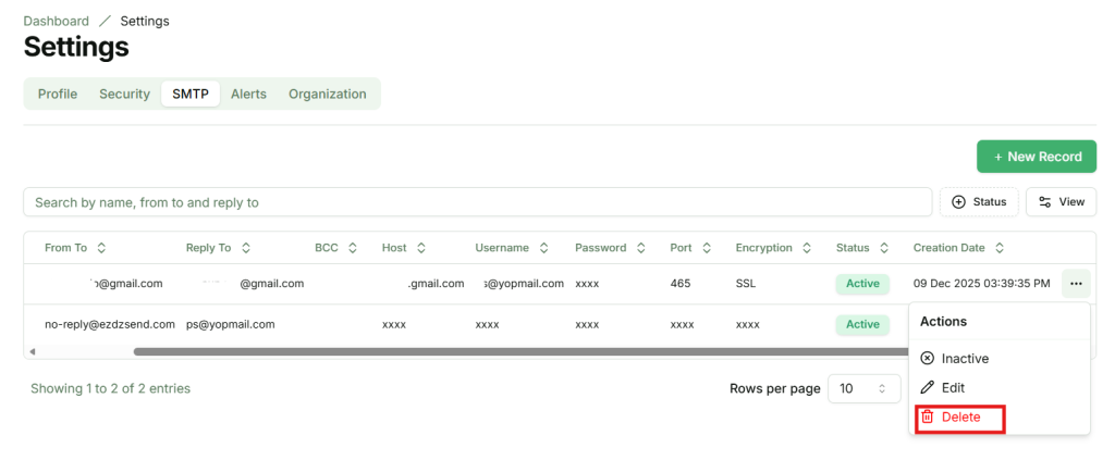 Sellers can permanently remove a SMTP from the SMTP List. Once deleted, the SMTP will no longer be available.