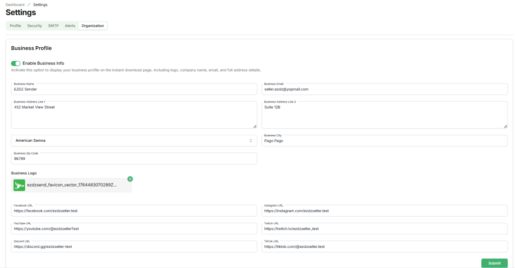 The Organization section allows sellers to manage their business profile. Activating this option will display your profile on the instant download page, including your logo, company name, email, and full address. You can also add or update social media links for Facebook, Instagram, YouTube, Twitch, Discord, and TikTok to enhance your online presence.